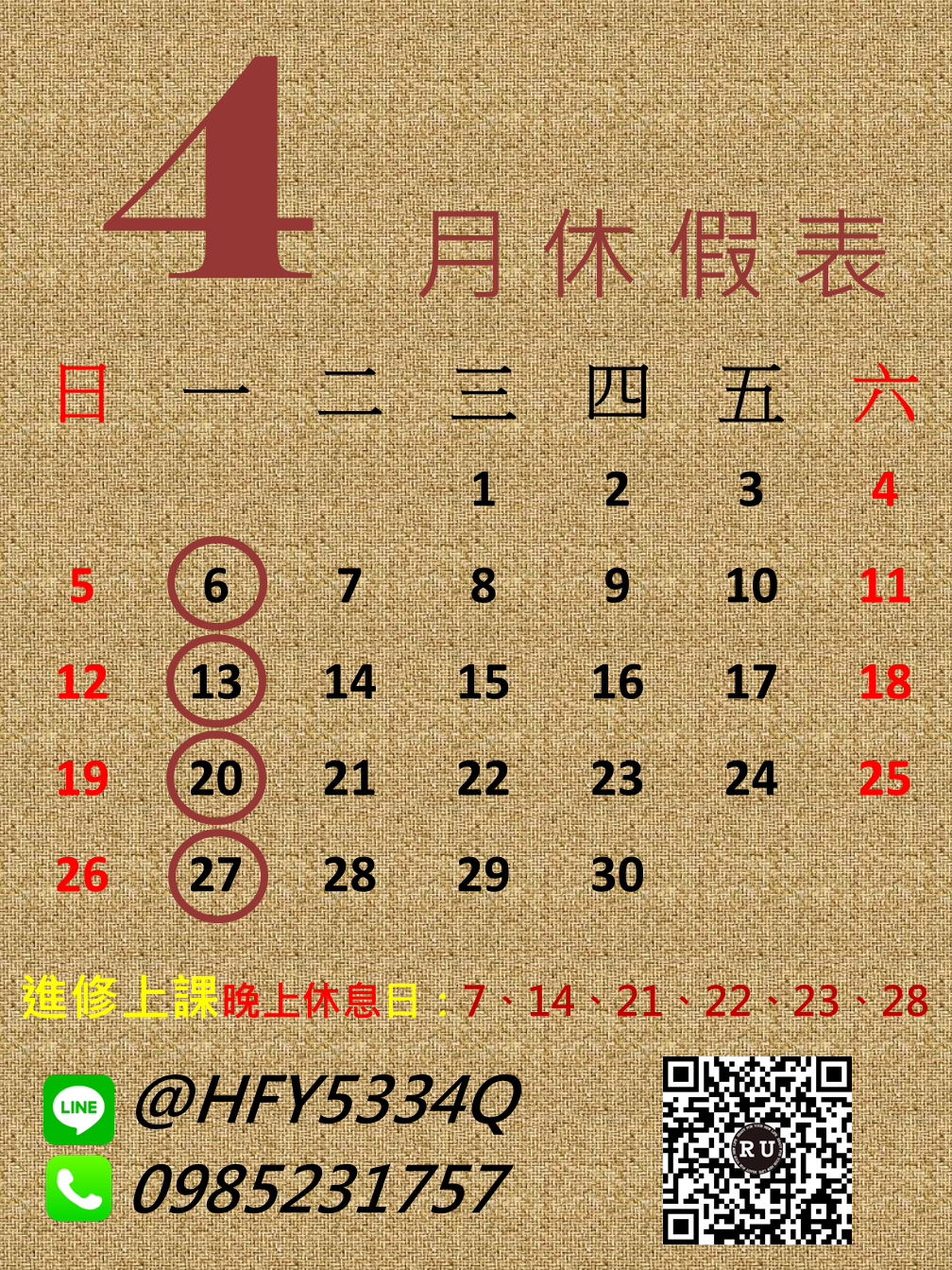 4月上課晚上休息的日期:7、14、21、22、23、28